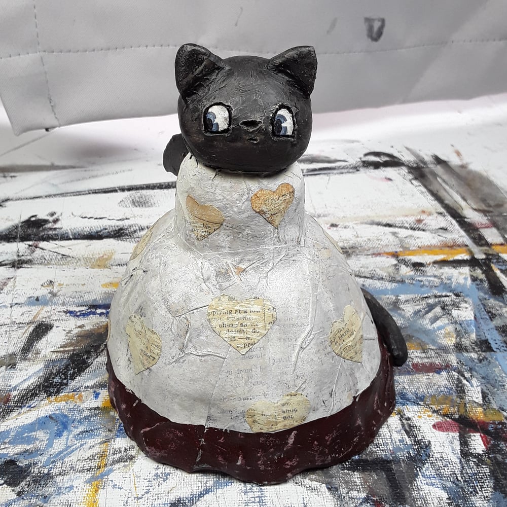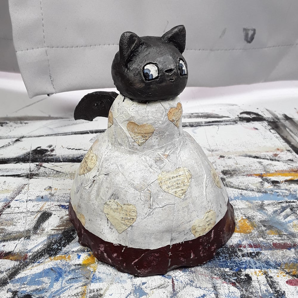 Small handmade ceramic sculpture with collage and acrylic - 5 inches (13cm) high, 4.5 inches (12cm) wide, 4.5 inches (12cm) deep. Sculpture only.