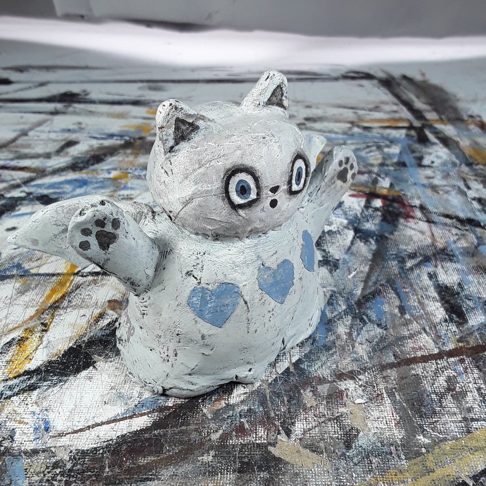 Small handmade ceramic sculpture with collage and acrylic - 3.5 inches (9cm) high, 5 inches (13cm) wide, 3 inches (8cm) deep. Sculpture only.